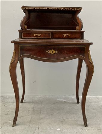 Scrittoio con alzata di forma mossa lastronato in mogano e filettato. Alzata a due cassetti e vano con ringhiera traforata, scrittoio ad un cassetto celante pianetto scorrevole con velluto impresso, gambe sagomate, profili e fregi in metallo dorato (cm 69x110x45) (difetti)