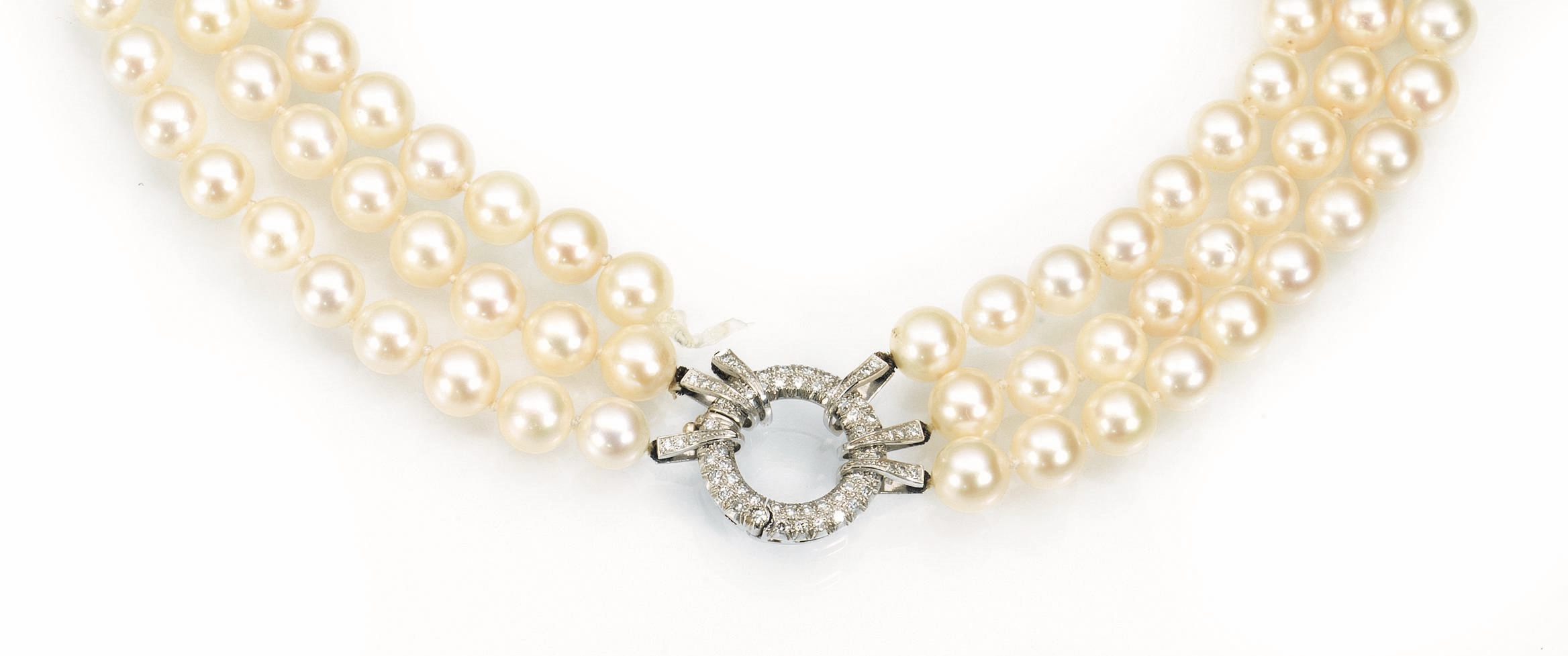 realizzata a tre fili di perle giapponesi diam. da mm 7 a mm 9, fermatura ad anello in pavè di brillanti, g 179, un filo staccato