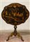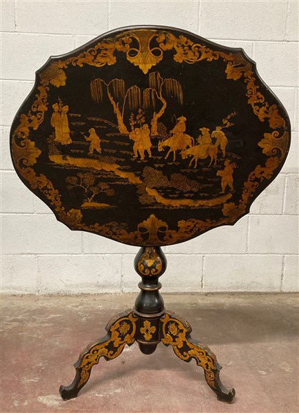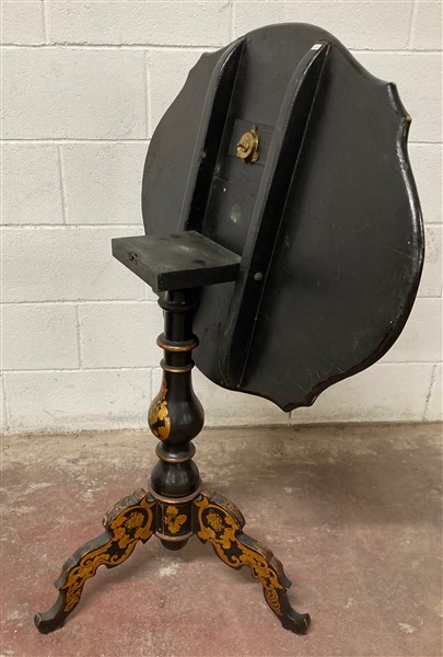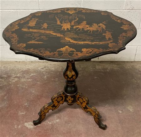 Tavolino a vela in legno ebanizzato con piano di forma sagomata decorato a chinoiserie in doratura, gamba centrale tornita terminante con piedi sagomati. Secolo XIX (cm 80x75x62) (difetti)