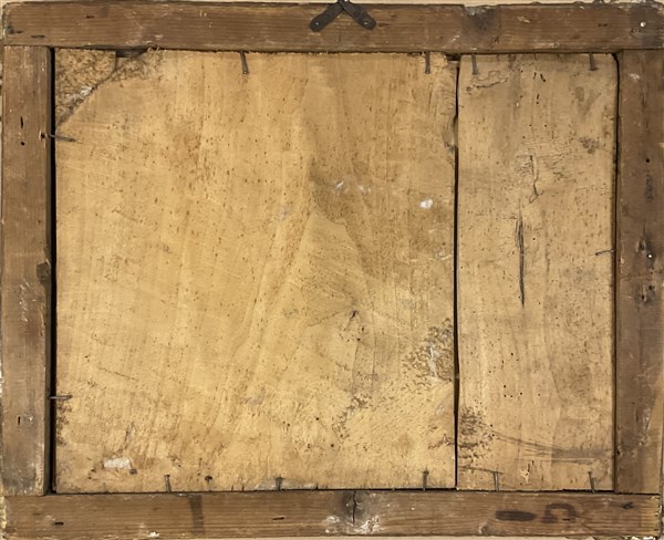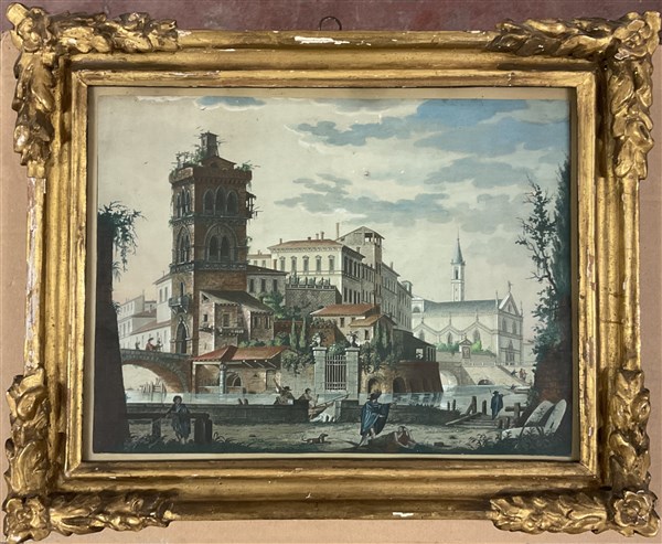 Stampa acquarellata raffigurante uno scorcio dei navigli di Milano (cm 35x45) in cornice dorata del secolo XVIII (difetti)