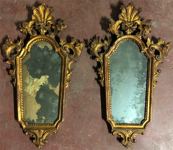 Coppia di specchiere in legno intagliato e dorato a volute e motivi floreali, cimasa a conchiglia, secolo XVIII (cm 40x70) (difetti e restauri)