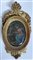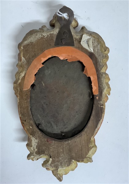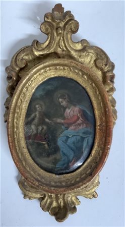 Scuola del secolo XVIII, "Madonna con Bambino ", olio su rame (cm 8x6), cornice in legno intagliato e dorato