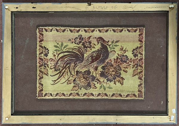 Arazzo meccanico del secolo XX raffigurante un fagiano tra rami fioriti. In cornice (cm 41,5x19) (difetti)