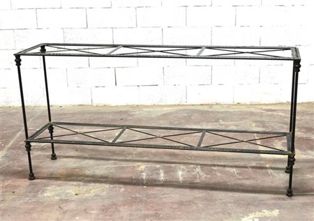 Etagere a due ripiani in ferro battuto, sostegni a tortiglione con lelementi decorativi torniti, profili scanalati, sostegni dei ripiani incrociati. Fine sec. XIX (cm 181x91x43) (difetti e mancanze)