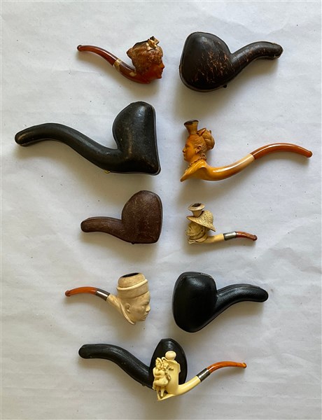 Lotto composto da cinque pipe in schiuma di mare intagliata e materiali differe