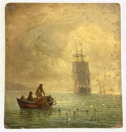 Adolphus Knell Knell "Pescatori e veliero sullo sfondo" olio su cartone pressato