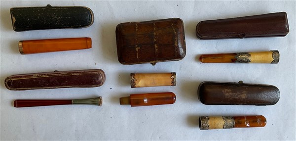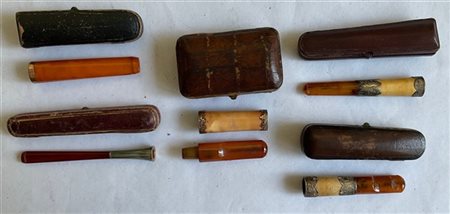 Lotto composto da cinque bocchini per pipe in materiali differenti,alcuni con ghiere in argento e ambra. In custodie (difetti)