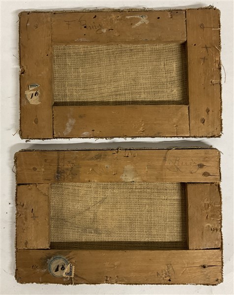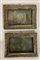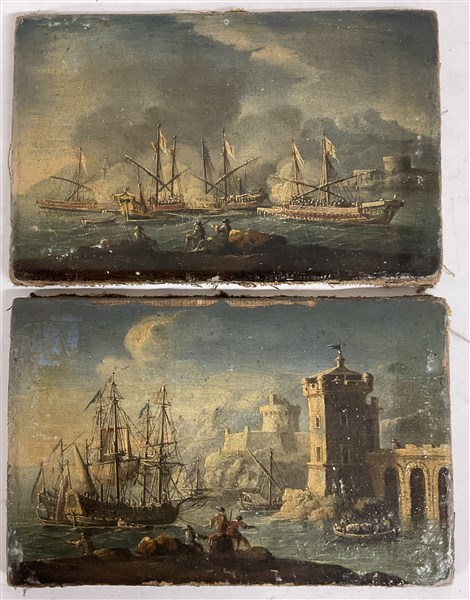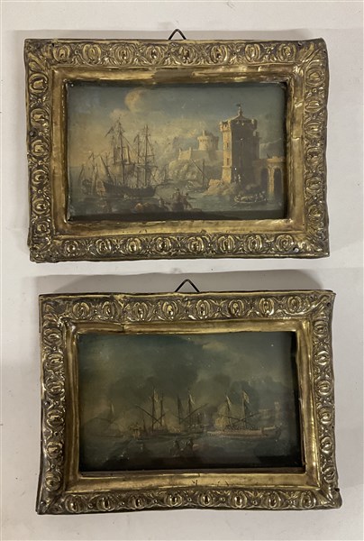 Scuola del secolo XVIII, coppia di dipinti raffiguranti "Marine", olio su tela (cm 12x18,5) in cornici antiche in legno con placca in metallo sbalzato e dorato
