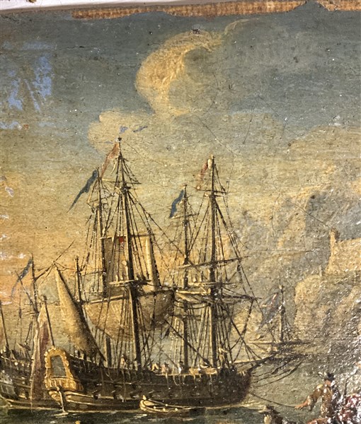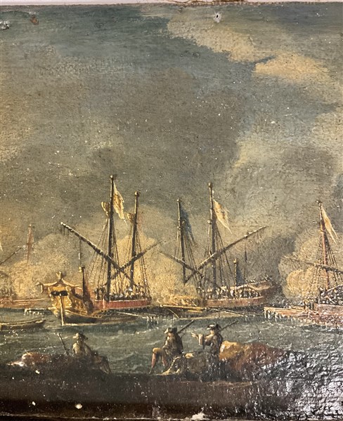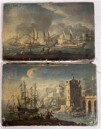 Scuola del secolo XVIII, coppia di dipinti raffiguranti "Marine", olio su tela