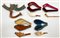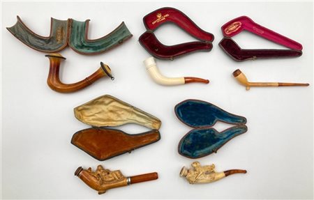 Lotto composto da cinque pipe in schiuma di mare intagliata e materiali differenti con soggetti diversi tra cui animali e figure, secolo XIX. In custodie (difetti e rotture)