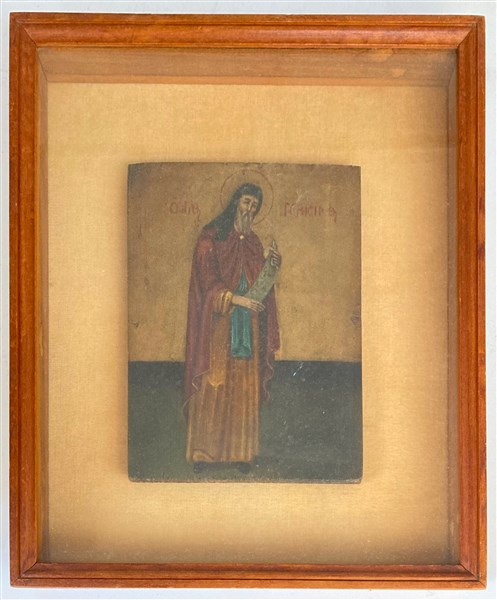 Icona a olio su tavola raffigurante Santo. Secolo XIX. Entro teca (cm 27,5x31,5