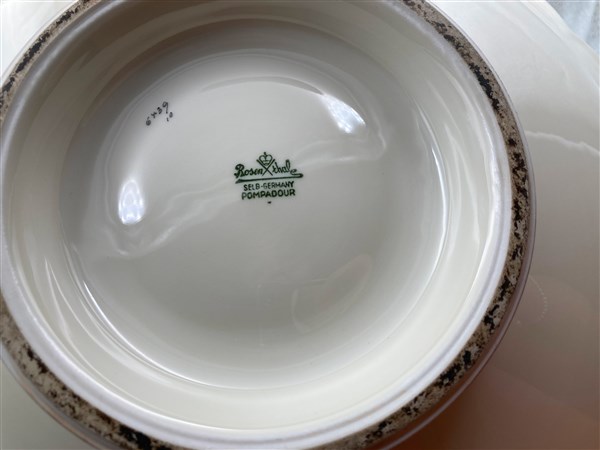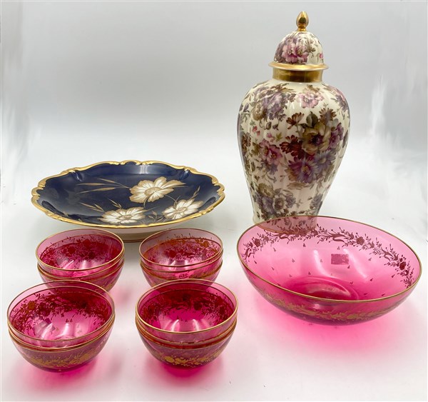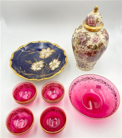 Lotto composto da un'alzata in ceramica di Rosenthal, un vaso in porcellana e un servizio da macedonia in vetro rosa decorato a dorature composta da dodici coppette e una ciotola (difetti)