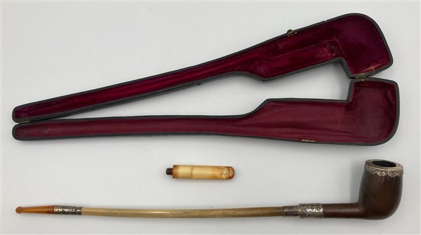 Grande pipa in legno intagliato, osso e ambra con ghiere in argento inciso, secolo XIX. In custodia (L. cm 35) (difetti)