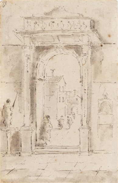 Francesco Guardi (attr.) (Venezia, 1712-1793) Portale con lo sfondo di un camp