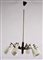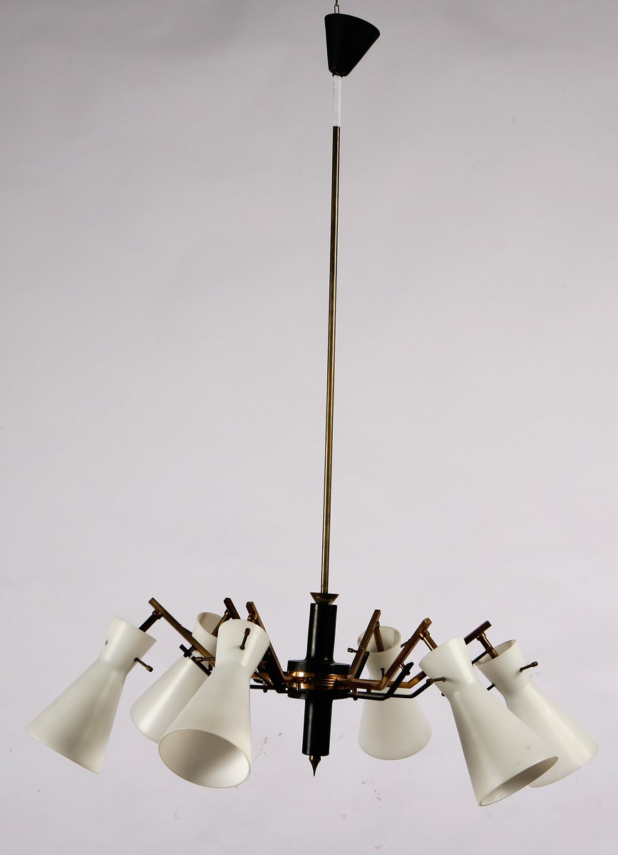 PRODUZIONE ITALIANA - ITALIAN WORK. Lampadario a sette luci. Chandelier with seven lights, painted steel, brass, milk glass. Acciaio verniciato, ottone, vetro opalino. Cm 75x95. Anni 60. Difetti. Defects.