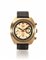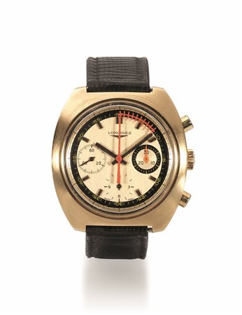 Cassa a cuscino in oro satinato, fondello a vite, pulsanti cronografici a pompa, vetro plastica . Quadrante champagne con anello dei numeri neri, indici applicati oro, registro dei 30 min. ad ore 3 con anello nero, contatore delle h ad ore 6, secondi continui ad ore 9, lancette a bastone oro con inserto in smalto nero, secondi cronografici con scala noniometrica in arancio. Movimento a carica manuale cal. 332. Cinturino in pelle Longines, fibbia ad ardiglione in oro giallo Longines. Diam. mm 39