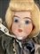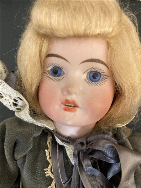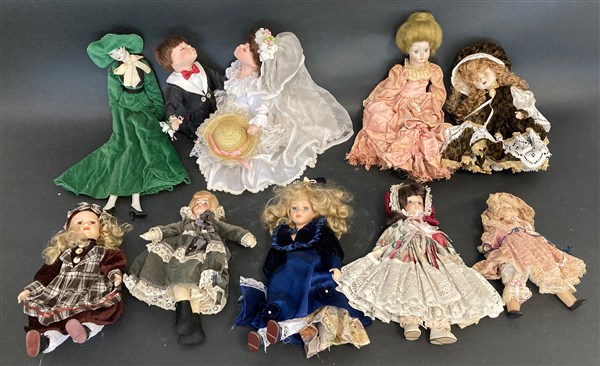 Cartone contenente dieci bambole da collezione di epoche differenti con volti e arti in ceramica dipinta, abiti in tessuto e pizzo (difetti)