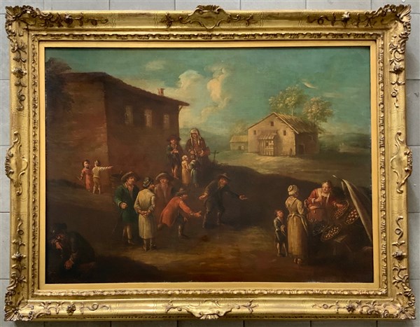 Scuola del XVIII secolo "Scena di villaggio" coppia di dipinti ad olio su tela (cm 69,5x97) in cornici