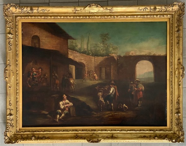Scuola del XVIII secolo "Scena di villaggio" coppia di dipinti ad olio su tela