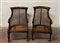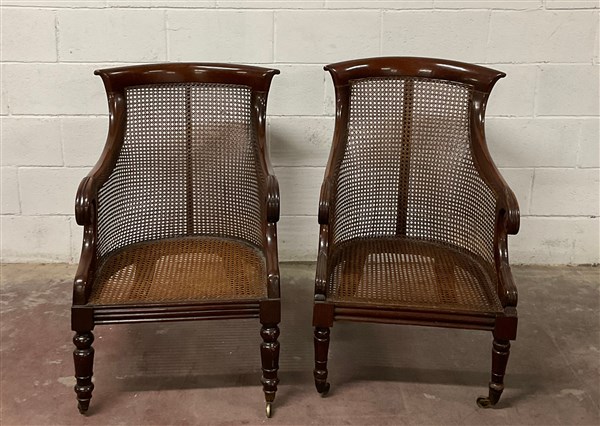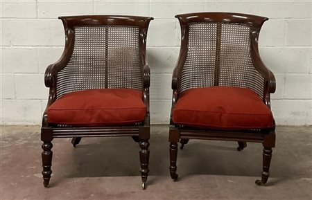 Coppia di poltrone di forma mossa lastronate in mogano, braccioli terminanti a ricciolo, fascia scanalata. Gambe anteriori tornite e posteriori a sciabola munite di rotelle. Schienale e seduta incannucciata. Inghilterra, secolo XIX (cm 57,5x87x56) (lievi difetti)