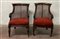 Coppia di poltrone di forma mossa lastronate in mogano, braccioli terminanti a