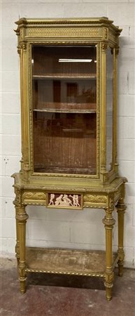Vetrina in legno intagliato laccato e dorato con parte superiore a due ante e vetri laterali entro montanti a colonne scanalate, parte inferiore di forma sagomata decorata a placca centrale con putti baccanti. Secolo XIX (cm 110x220x40) (difetti)