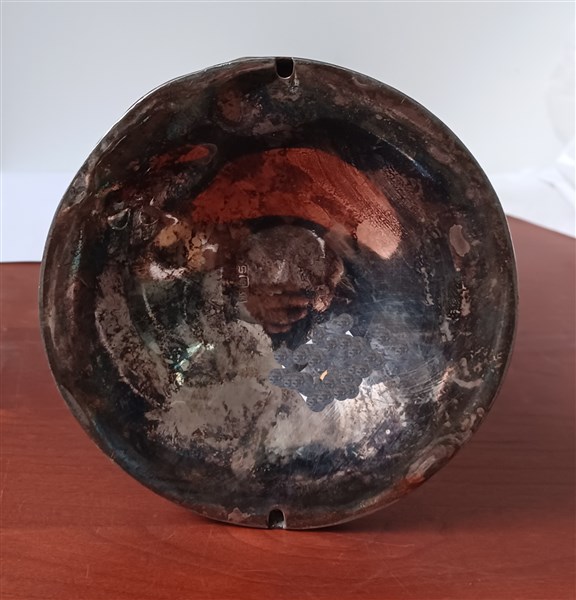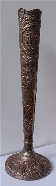 Vaso in metallo sbalzato a scene di genere entro riserve decorate a volute fogliate, valve di conchiglia, fiori e volatili. Fusto inciso con monogramma "W" e base "New Orleans 2/24/19". Germania, secolo XIX (h. cm 46) (lievi difetti)