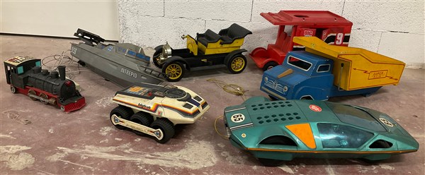 Lotto di tre cartoni contenenti numerosi giocattoli vintage in legno e material