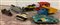 Lotto di tre cartoni contenenti numerosi giocattoli vintage in legno e materiale plastico (difetti e mancanze)