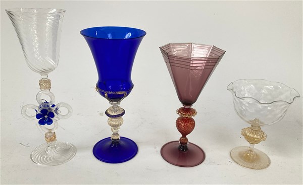 Manifattura di Murano. Lotto composto da quattro bicchieri differenti (lievi di