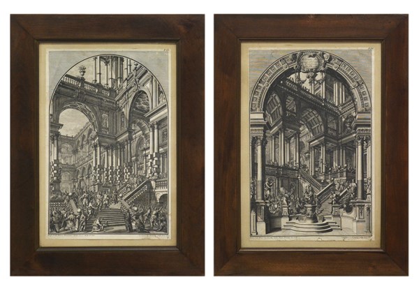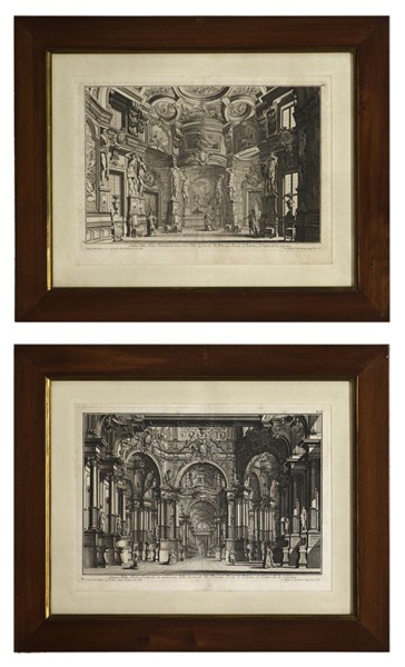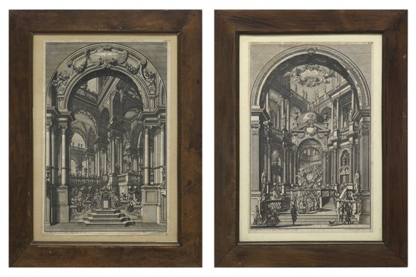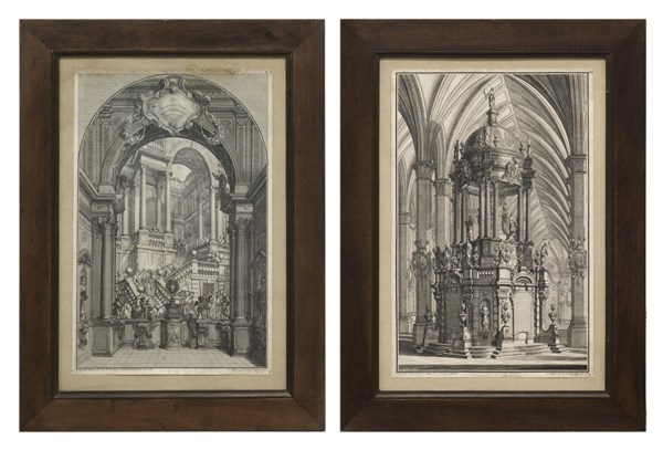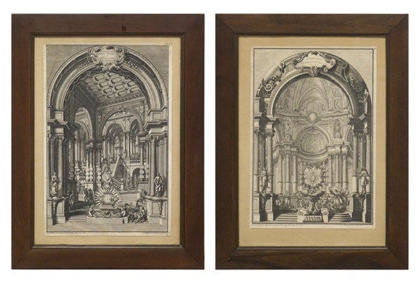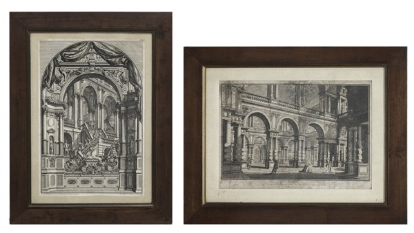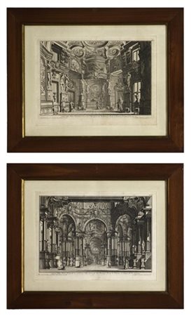 Gruppo di dodici incisioni della serie "Architetture, e prospettive dedicate alla maesta di Carlo Sesto" undici incise da Johann Andréas Pfeffel e una da Lorenzo Zucchi, da invenzioni di Giuseppe Galli Bibiena (le nove verticali circa cm 51x33 e le tre orizzontali circa cm 33x48). In cornici
