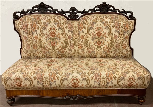 Divano a tre posti in noce con cimasa sagomata e intagliata a volute, valve di conchiglie e cornucopie. Secolo XIX (cm ) (difetti)