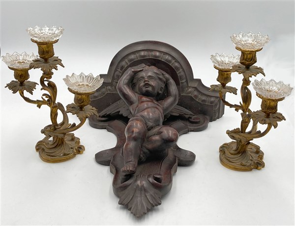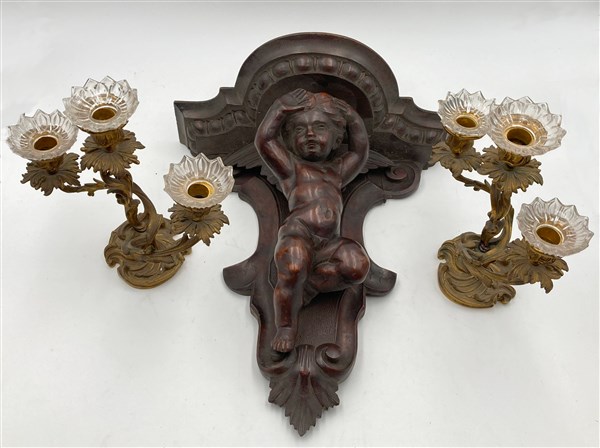 Lotto composto da due candelieri a tre fiamme ed una mensola in legno intagliato raffigurante un putto (difetti)