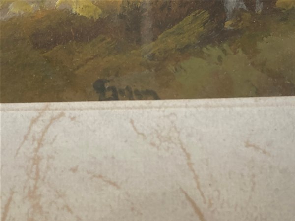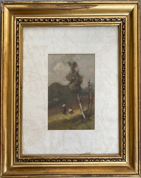 (attr.) "Paesaggio con figure" olio su cartoncino (cm 10x7) Firmato in basso al centro. In cornice