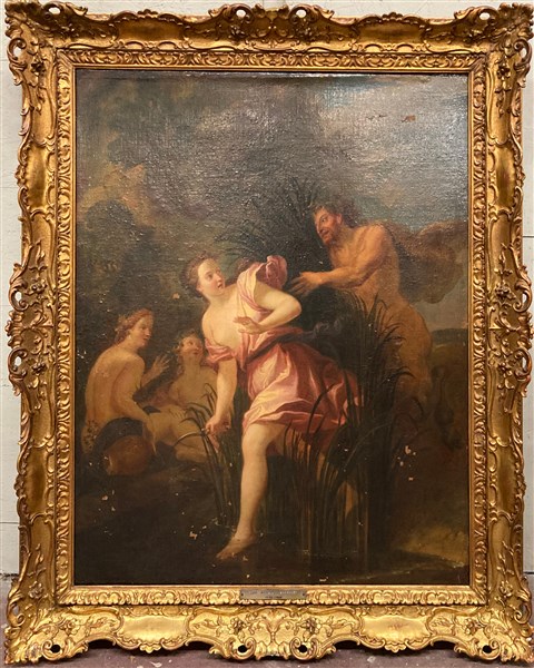 Ignoto, antico dipinto raffigurante "Pan e Siringa", olio su tela (cm 92x73). In cornice (difetti e restauri)
