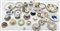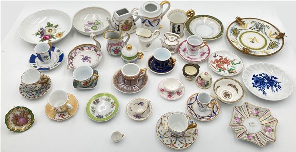 Cartone contenente tazzine con piattini e oggetti vari in porcellana e ceramica di forme, dimensioni e decori diversi (difetti)