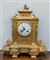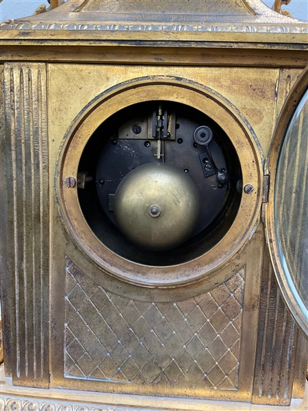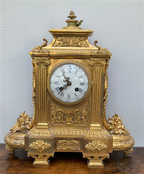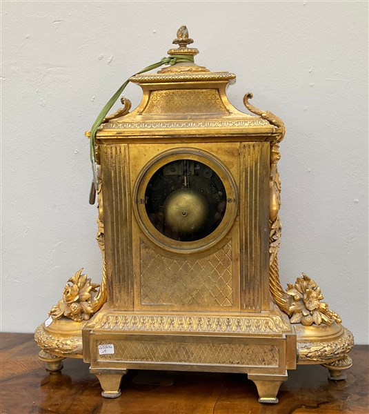Pendola in bronzo dorato con cassa di forma architettonica decorata a lesene e motivi vegetali. Quadrante in smalto bianco a numeri romani per le ore, arabi per i minuti. Movimento a due treni con suoneria delle ore e mezze (h. cm 33) (difetti e mancanze)