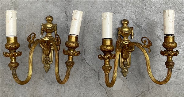 Coppia di applique a due luci in metallo dorato decorate a vasi con festoni e volute (h. cm 16) (difetti)