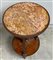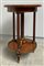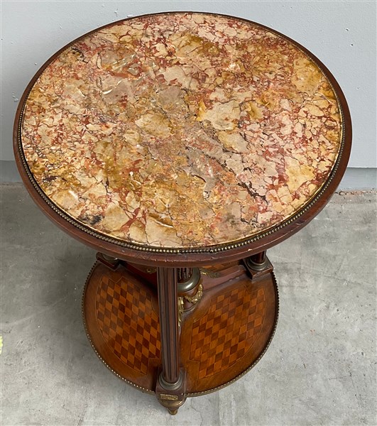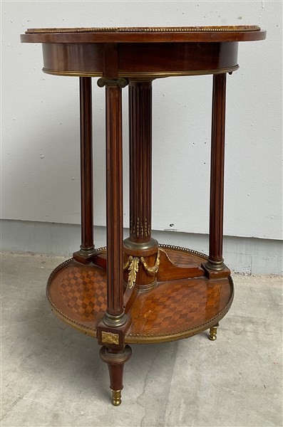 Tavolino con piano tondo in marmo entro perlinature. Sostegni a colonne scanalate con fregi in bronzo dorato riuniti da pianetto intarsiato a motivi geometrici (d. cm 49