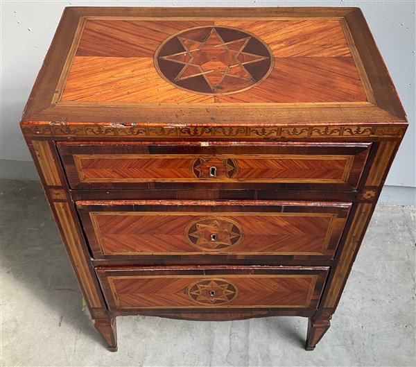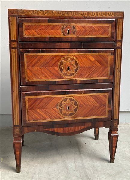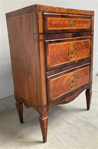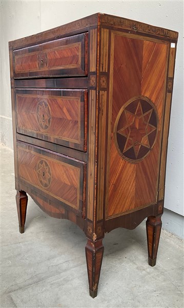 Comodino intarsiato in legni vari con fronte a due cassetti sotto uno a mezza altezza riquadrati e centrati come piano e fianchi da stella ottagonale (cm 61x90x36) (difetti, rotture e restauri)
