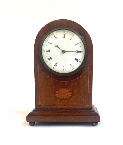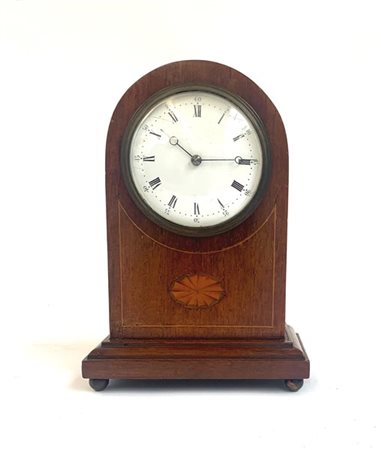 Orologio da tavolo con cassa in legno intarsiato. Quadrante in smalto bianco a numeri romani per le ore e arabi per i minuti. Movimento a bilanciere (cm 15x22x9) (difetti)