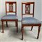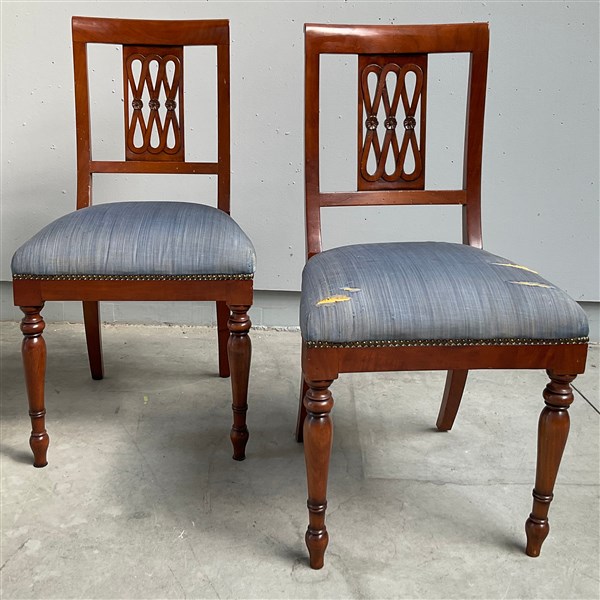 Coppia di sedie in legno con schienale a giorno intagliato a intrecci e fiori. Seduta imbottita (difetti)