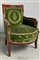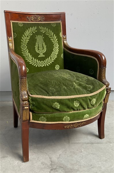 Poltrona in legno con fregi in bronzo dorato. Braccioli intagliati a guisa di delfino. Rivestita e imbottita in velluto verde (difetti)