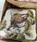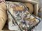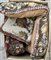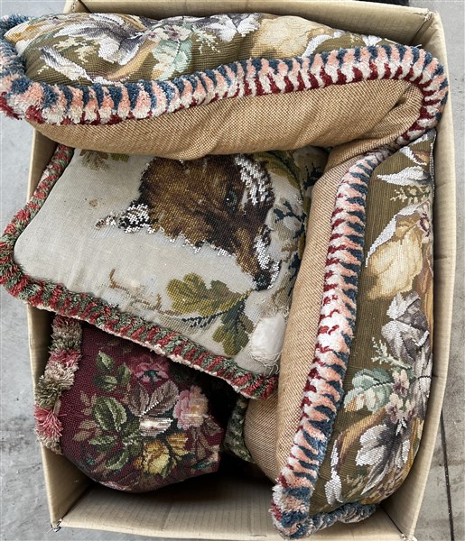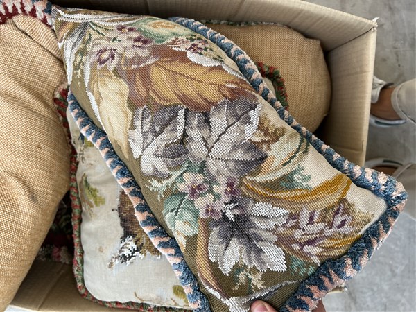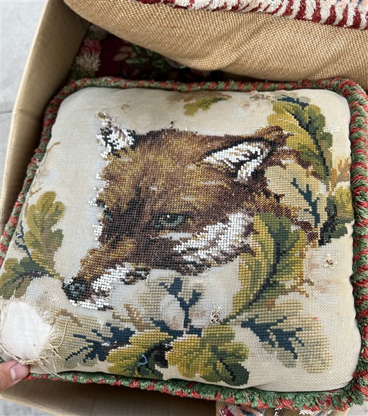 Cartone contenente sei cuscini decorati a piccolo punto con perline (difetti)