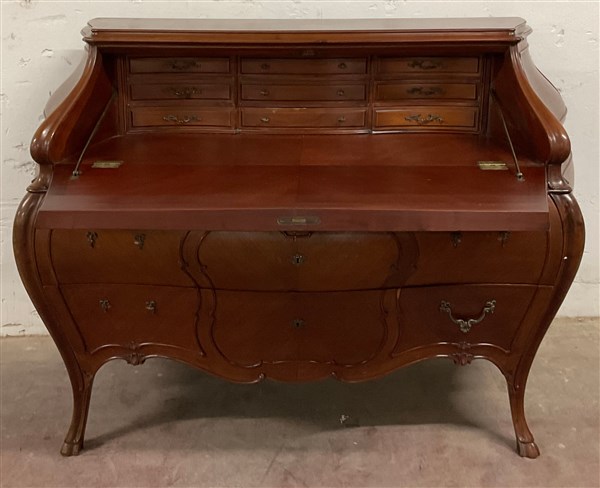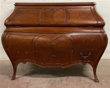 Ribalta di forma bombata decorata a cartelle sagomate, fronte a due cassetti e anta celante tiretti. Gambe mosse terminanti a zoccolo (cm 145x110x63) (difetti)