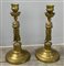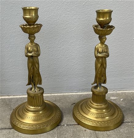 Coppia di candelieri in bronzo con fusto a tutto tondo poggiante su base a plin