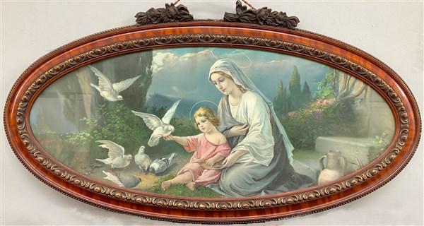 Oleografia raffigurante Madonna con Bambino (cm 50x120) , in cornice (difetti e mancanze alla cornice)