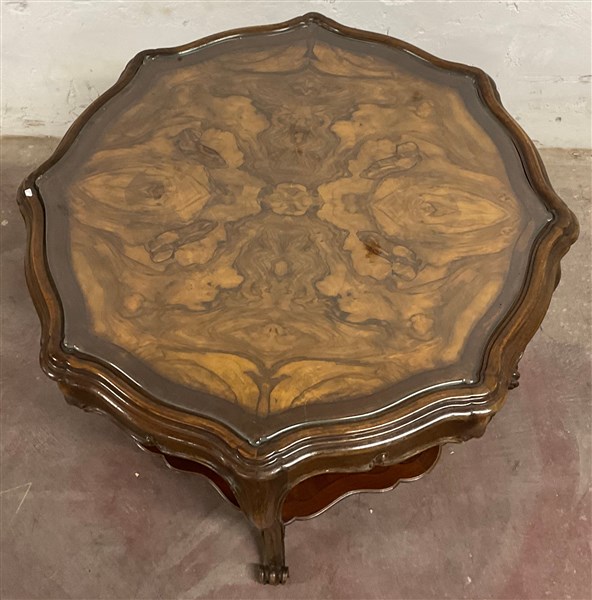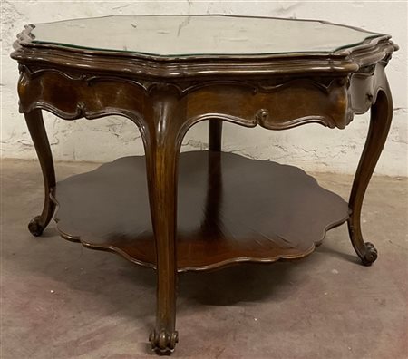 Tavolino da salotto con piano in radica in legno intagliato di forma sagomata, gambe mosse riunite da pianetto con piedi terminanti a ricciolo, piano in vetro (cm 97x62x97) (difetti)