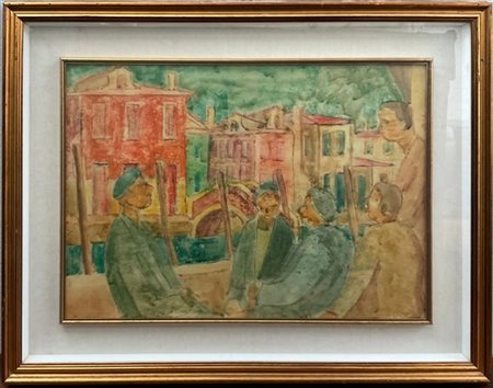 Uomini a Burano"1981, tecnica mista su carta applicata su compensato (cm 50x70), firmata, titolata e datata al retro.