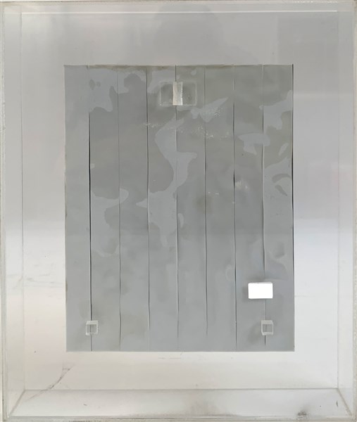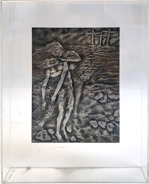 Bassorilievo in metallo (cm 25x20) firmata in basso a destra, in teca in plexiglass
